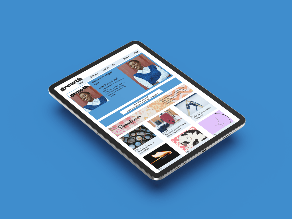 The brief only required a 12 page spread, with 2 ads and a web friendly equivalent which was created in Adobe XD. The masthead uses a heavily modified typeface Maple Black, and the photos were chosen to create the feel of a visit to a local arts fair. The name Growth was chosen for the fact that growth can happen as both a mindset and in a way that affects the world around the reader. Text was written by ChatGPT. I adapted the Spoonflower ad, so that it might tempt the reader into the possibilities that might be purchased from the store.