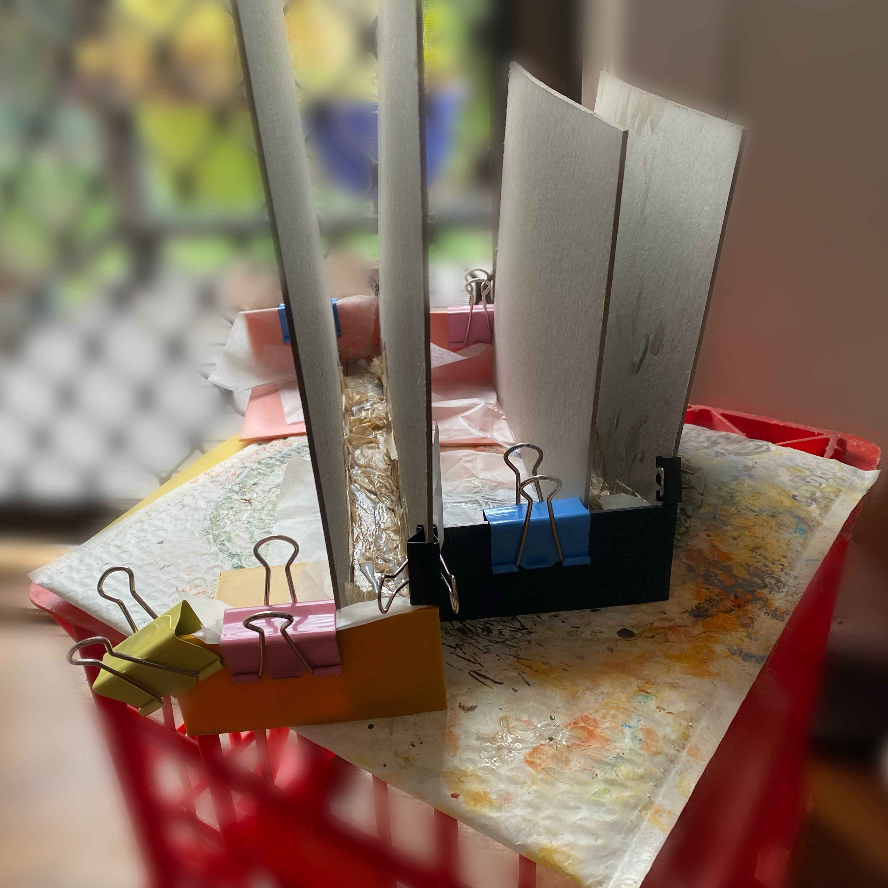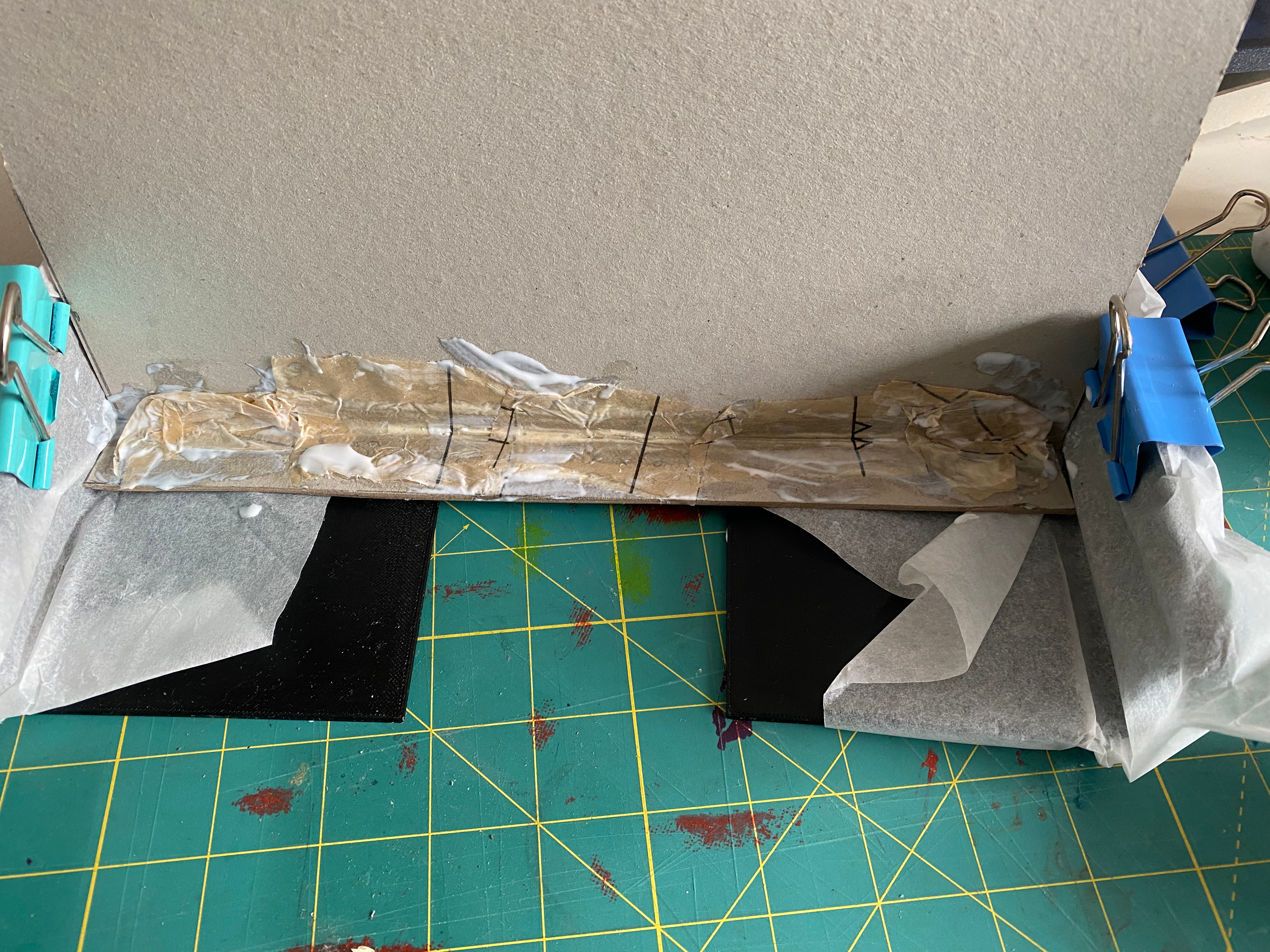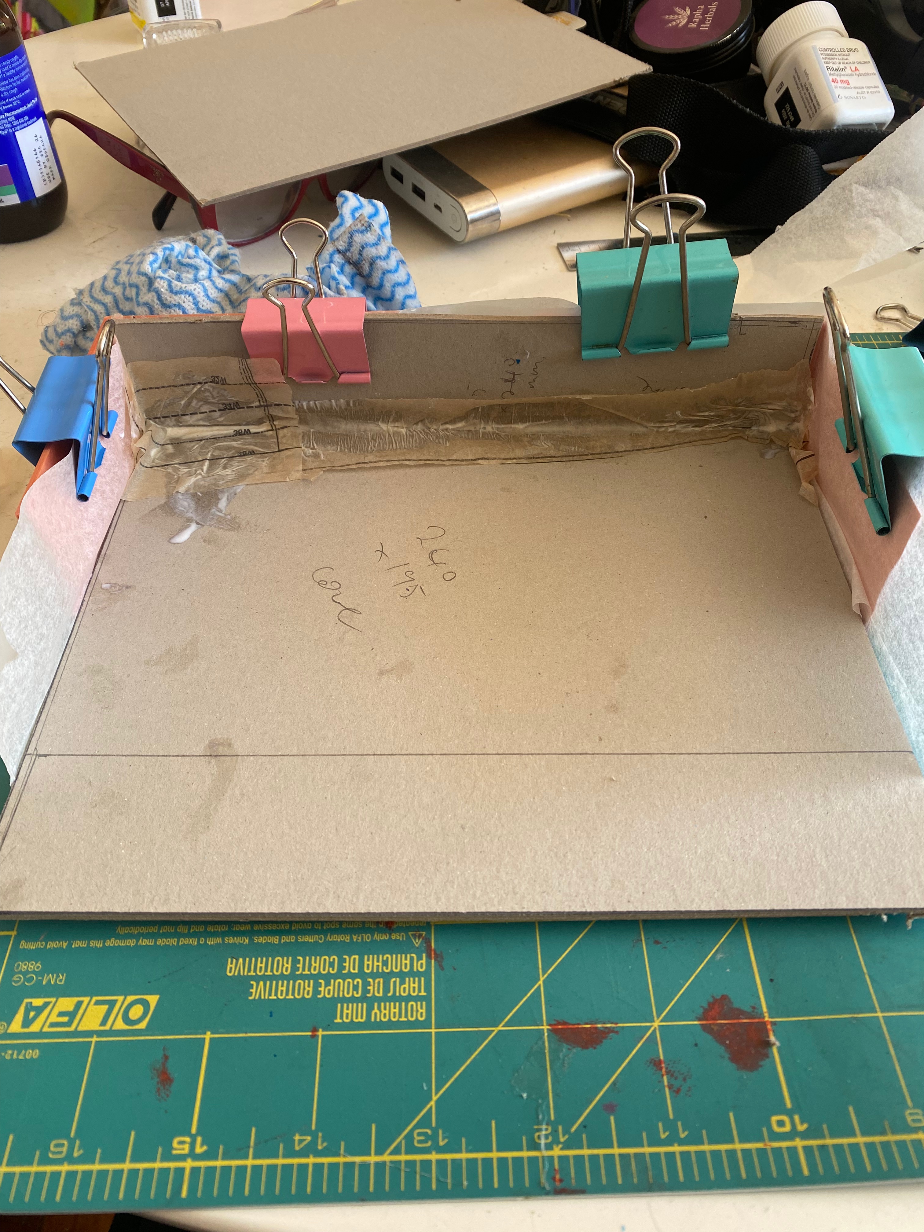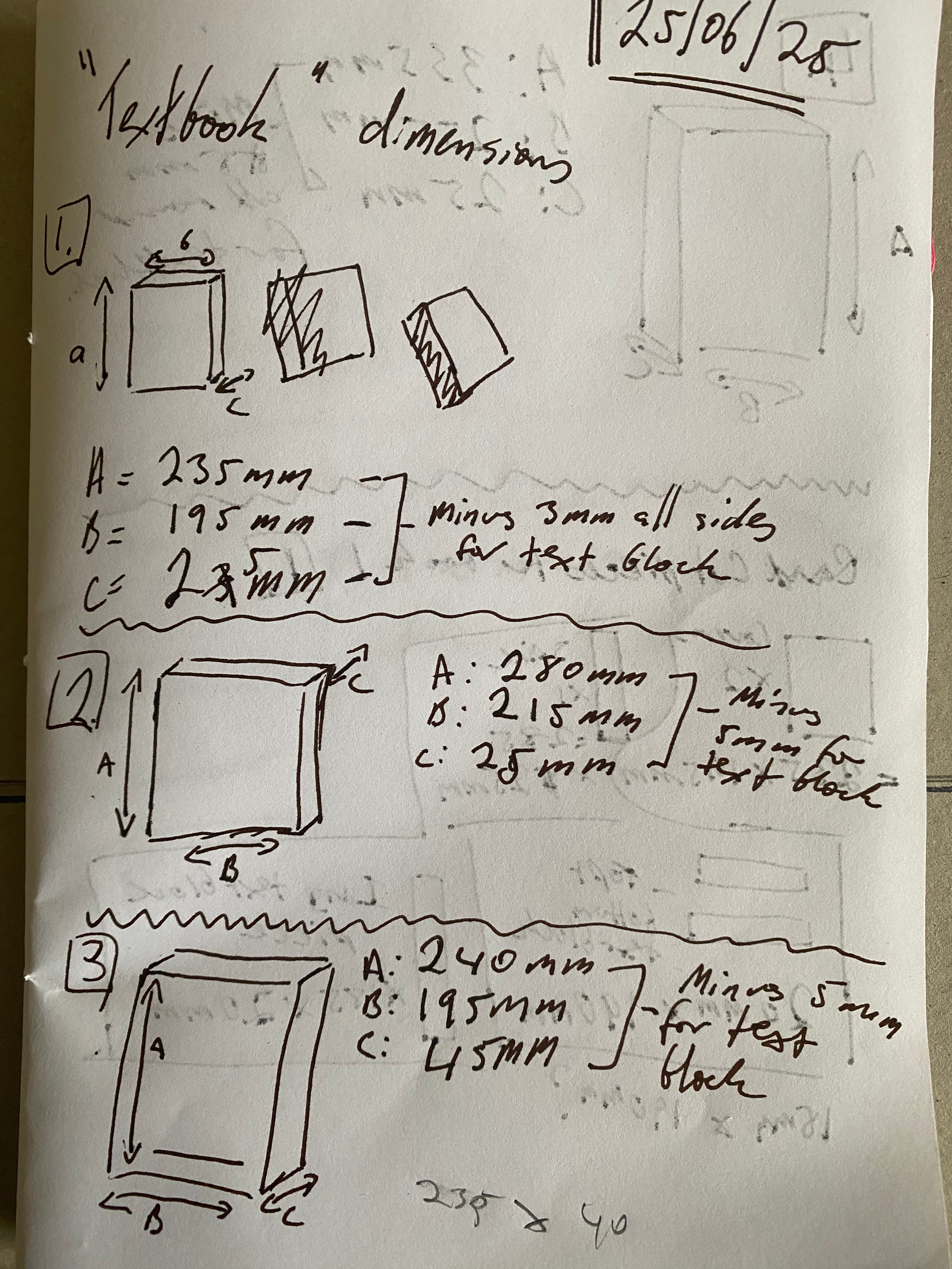 I examined my personal collection of books and looked at which ones could pass as textbooks. After taking numerous measurements, I designed the books so there was an obvious ‘cover’ and slightly smaller ‘pages’. The books were cut out of bookbinders board that I already owned, and the inside joints where glued together with pva glue and reinforced with sewing pattern paper that I had on hand. This glue and paper combination was strong, flexible and somewhat translucent when dried.