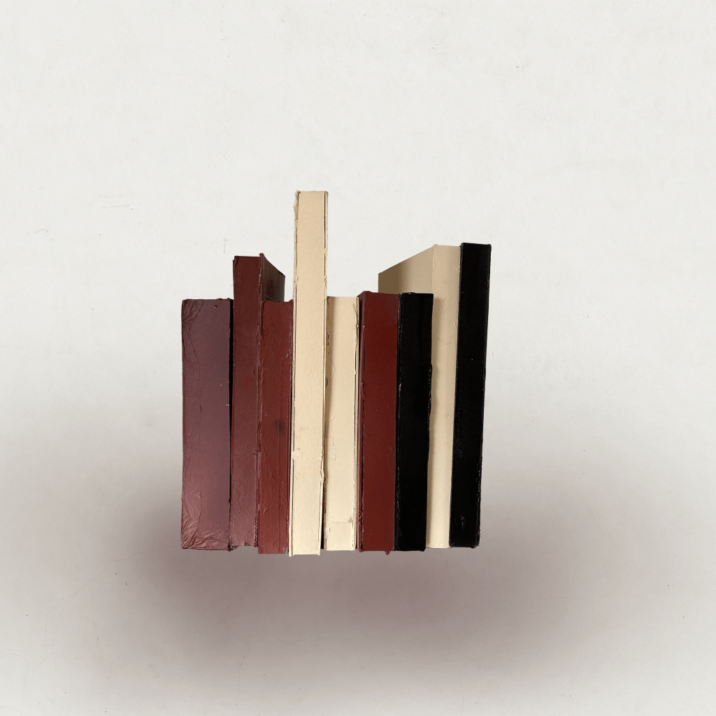 9 fake textbooks in various shades of brown, cream, and black. 5 grey fabric cubes half covered with brightly coloured fabric.