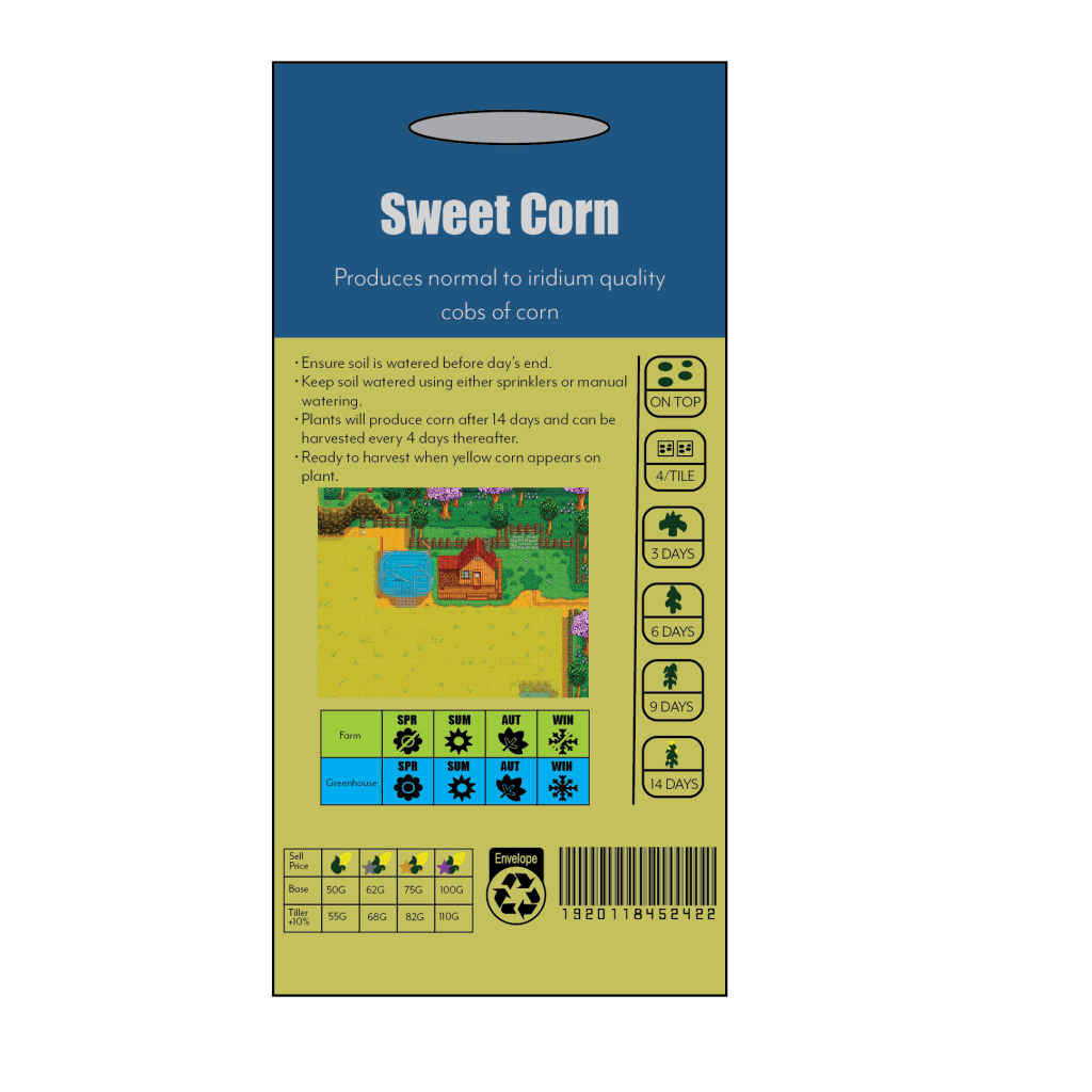 I wanted the back of the packet to be an in-game look copy of real seed packaging, so heavily referencing the Stardew Valley wiki, I used planting and selling information that would be very useful to a player, while also trying to remain a little bit vague, as players will often adopt their own planting style in accordance to a number of player controlled factors.